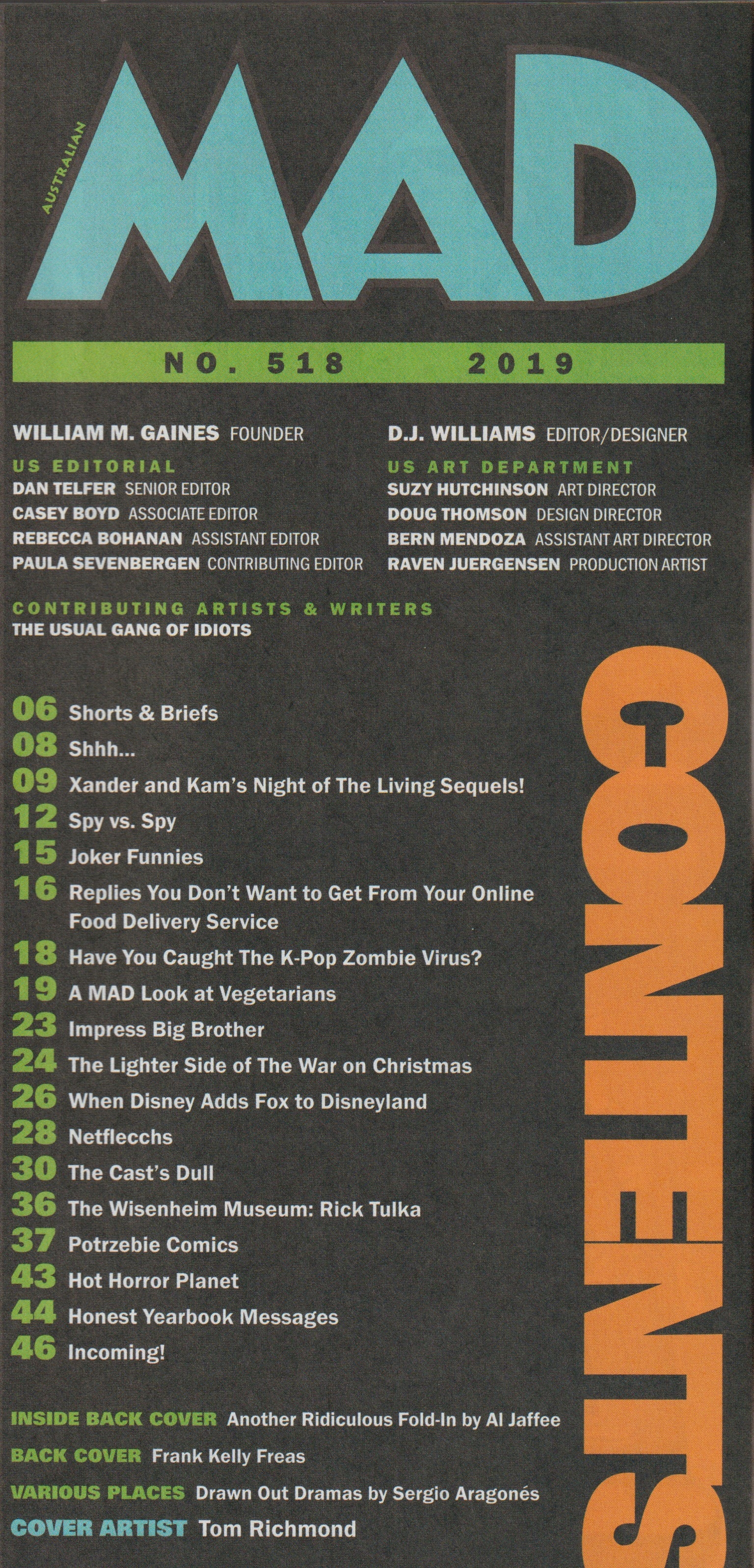 MAD Magazine #518 MAD Magazine (Australia) Updated: November 28th, 2019 Country: AustraliaCompany: nextmedia Pty LtdPublished: December 1st, 2019Cover: K-Pop - It - Online Eats - JokerSale price: AU$6.99Pages: 52Format: MagazineInserts: - Editorial Editor: Dave WilliamsProduction Manager: Peter RymanCirculation Director: Carole JonesCover Artist: Tom RichmondGraphics Consultant: Jono BishopExecutive Chairman: David GardinerManaging Director: Hamish Bayliss Additional Images