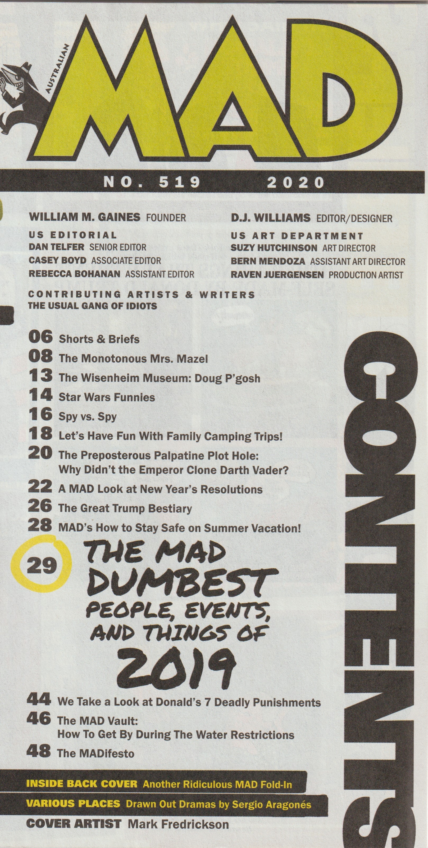 MAD Magazine #519 MAD Magazine (Australia) Updated: May 7th, 2020 Country: AustraliaCompany: nextmedia Pty LtdPublished: January 2020Cover: We Burn: Star wars Mrs Mazel & New YearOriginal cover: MAD About the Trump Era • USA • 1st Edition - New YorkSale price: AU$6.99Pages: 52Format: Magazine Editorial Editor: Dave WilliamsCover Artist: Mark Fredrickson Additional Images Cover Variations USA
