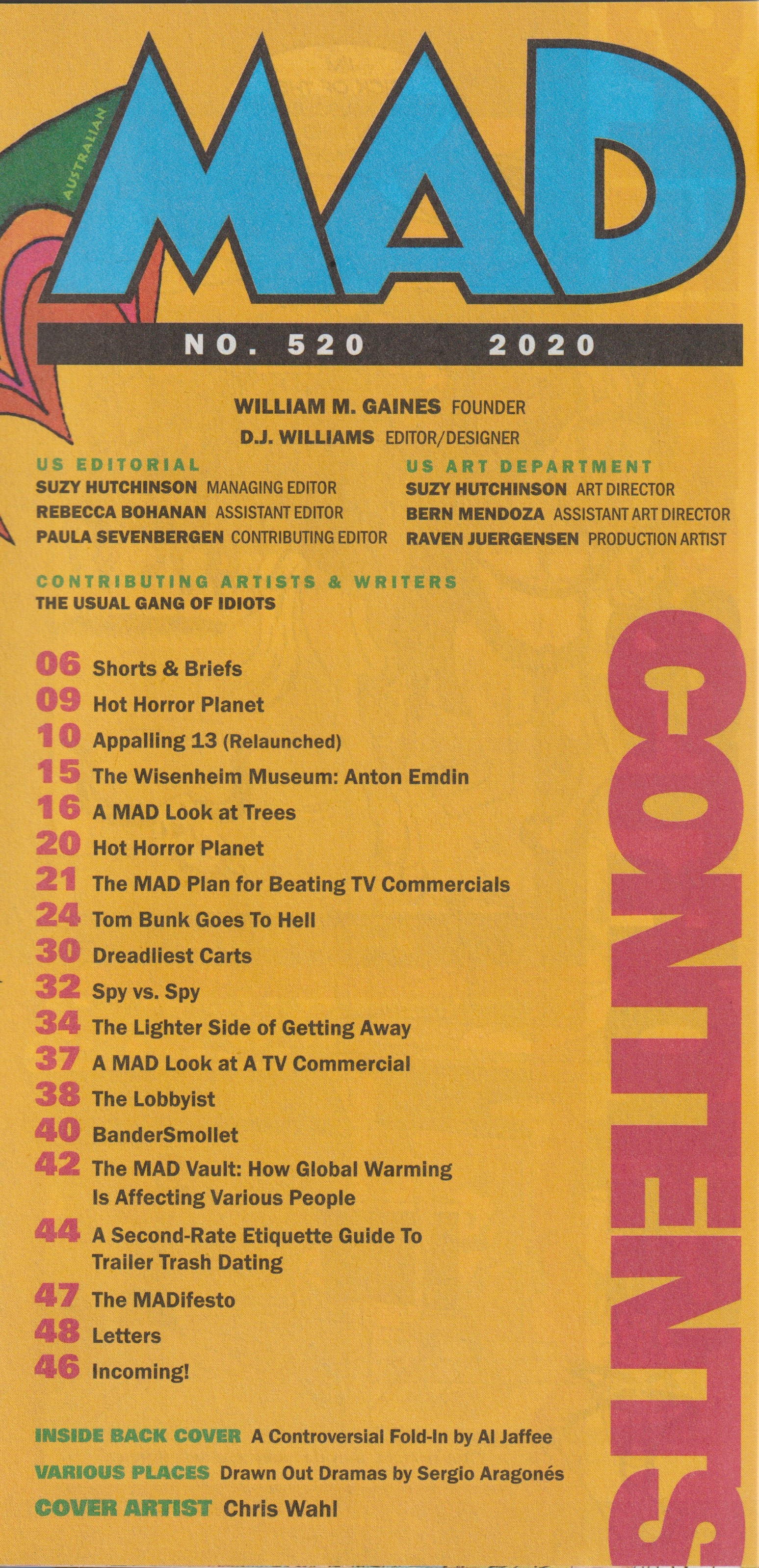 MAD Magazine #520 MAD Magazine (Australia) Updated: May 7th, 2020 Country: AustraliaCompany: nextmedia Pty LtdPublished: June 2020Cover: We Tom Bunk goes to HellOriginal cover: MAD Magazine #7 • USA • 2nd Edition - CaliforniaSale price: AU$6.99Pages: 52Format: Magazine Editorial Editor: Dave WilliamsCover Artist: Chris WahlProduction Manager: Peter RymanCirculation Director: Carole JonesGraphics Consultant: Jono BishopManaging Director: Hamish Bayliss Additional Images Cover Variations USA