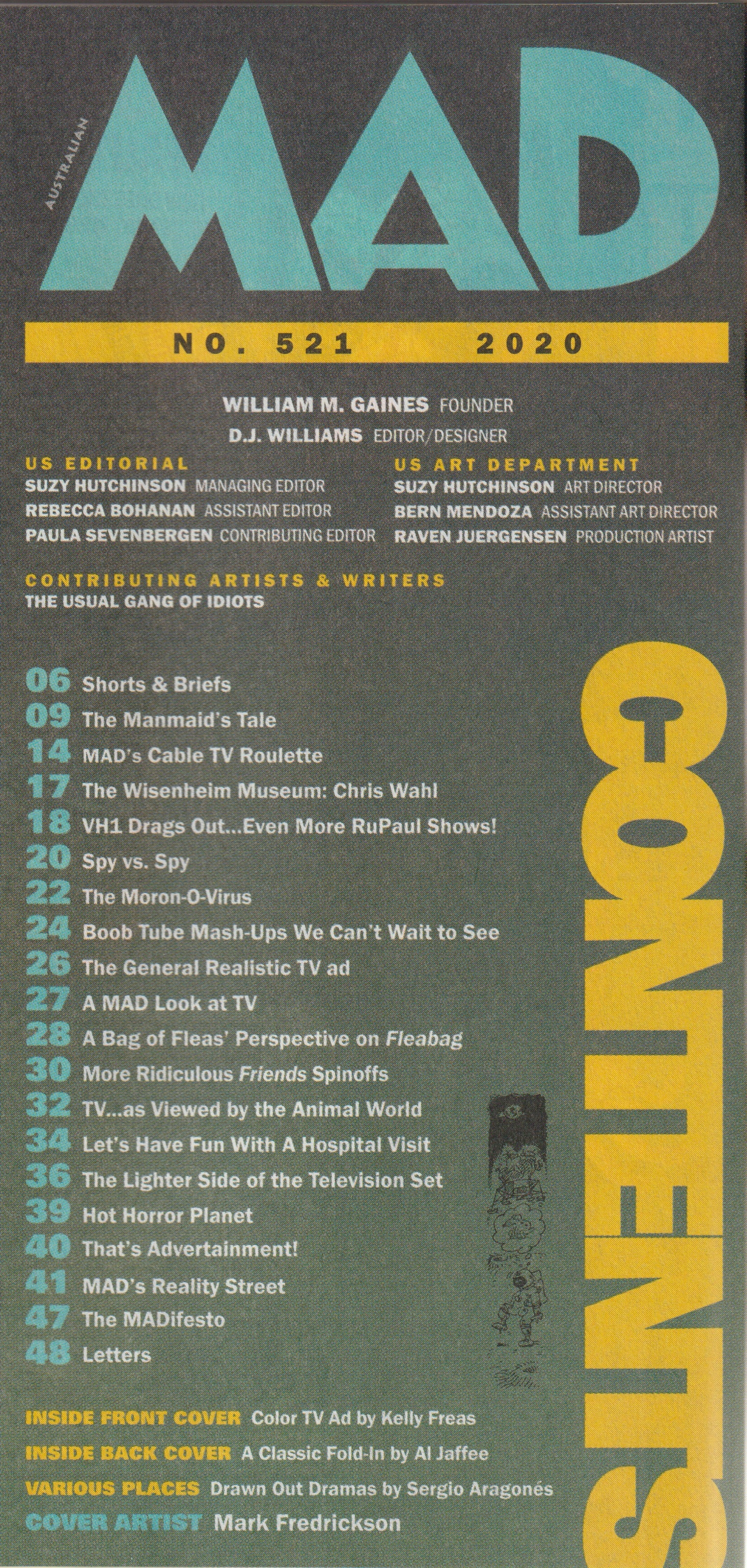 MAD Magazine #521 MAD Magazine (Australia) Updated: June 29th, 2020 Country: AustraliaCompany: nextmedia Pty LtdPublished: August 2020Cover: MAD Screens TVOriginal cover: MAD Magazine #12 • USA • 2nd Edition - CaliforniaSale price: AU$6.99Pages: 52Format: Magazine Editorial Editor: Dave WilliamsCover Artist: Mark FredricksonProduction Manager: Peter RymanCirculation Director: Carole JonesGraphics Consultant: Jono BishopManaging Director: Hamish Bayliss Additional Images Cover Variations USA