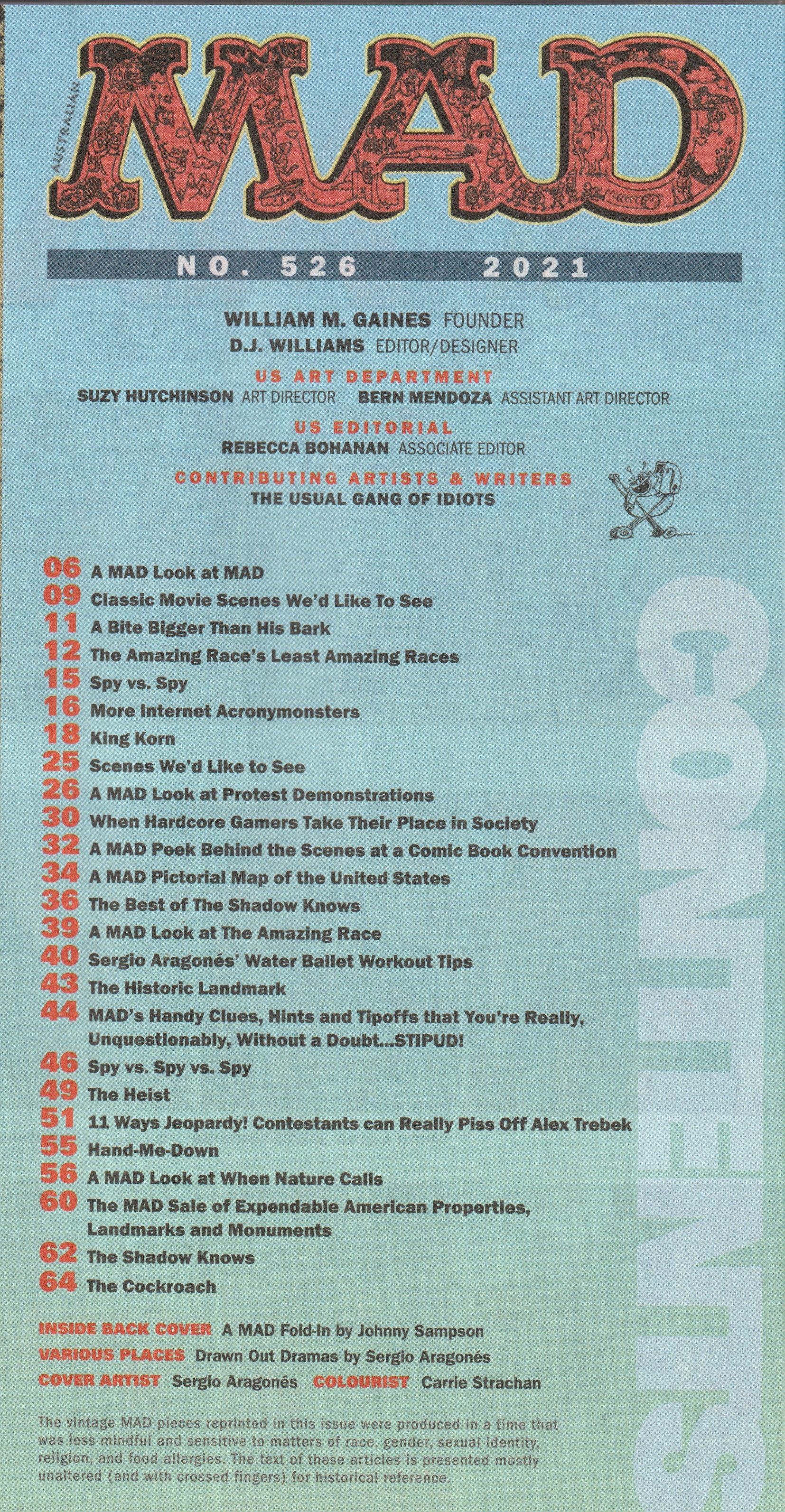 MAD Magazine #526 MAD Magazine (Australia) Updated: March 30th, 2021 Country: AustraliaCompany: nextmedia Pty LtdPublished: April 2021Cover: Sergio's MAD TravelsOriginal cover: MAD Magazine #17 • USA • 2nd Edition - CaliforniaSale price: AU$7.50Pages: 52Format: Magazine Editorial Cover Artist: Sergio AragonésEditor: Dave WilliamsProduction Manager: Peter RymanCirculation Director: Carole JonesGraphics Consultant: Jono BishopManaging Director: Arek WidawskiAssociate Publisher: Daniel Findlay Additional Images Cover Variations USA