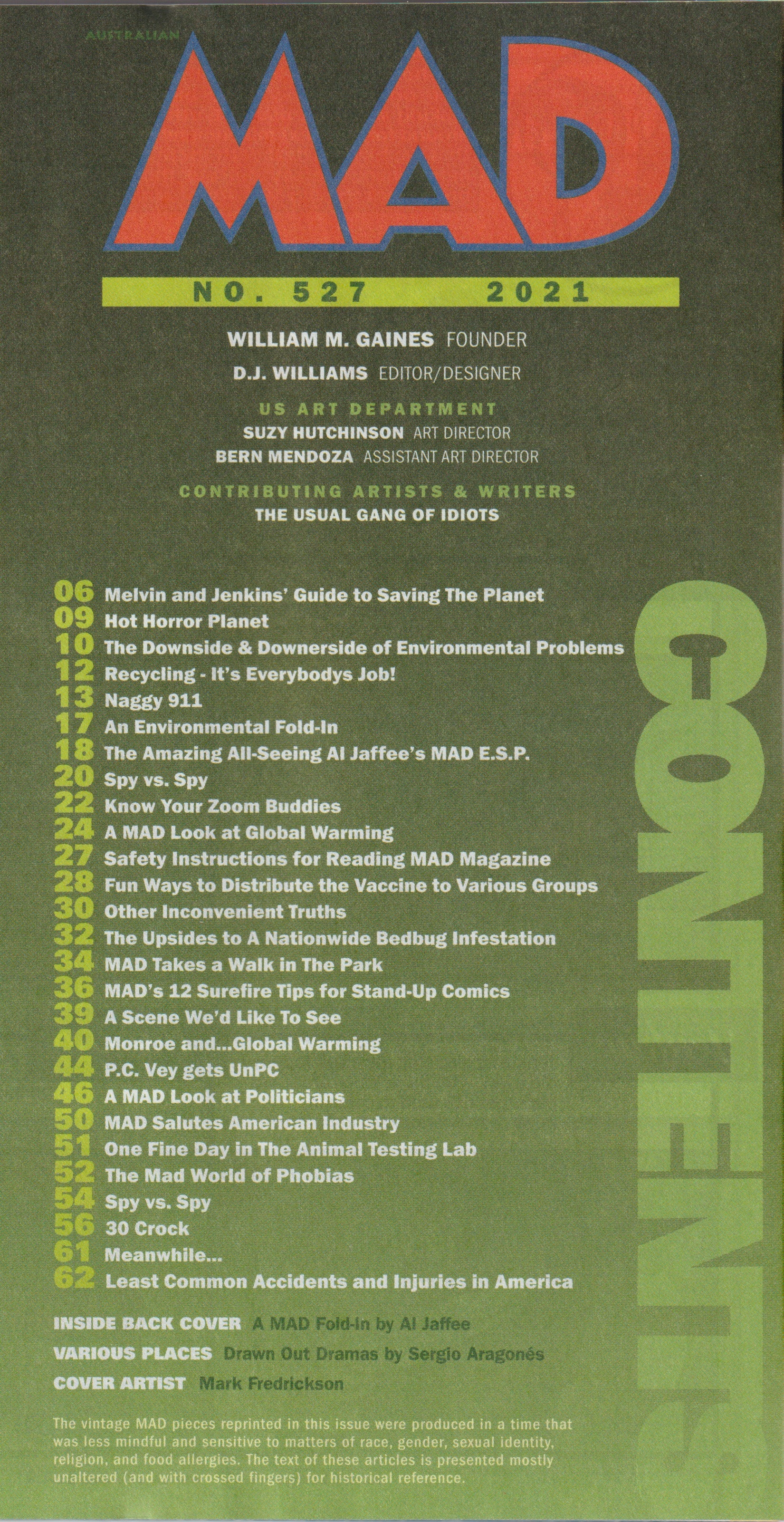 MAD Magazine #527 MAD Magazine (Australia) Updated: September 3rd, 2021 Country: AustraliaCompany: nextmedia Pty LtdPublished: July 2021Cover: MAD Magazine saves the planet almost!!Original cover: MAD Magazine #494 • USA • 1st Edition - New YorkSale price: AU$7.50Pages: 52Format: Magazine Editorial Editor: Dave WilliamsCover Artist: Mark FredricksonProduction Manager: Peter RymanCirculation Director: Carole JonesGraphics Consultant: Jono BishopManaging Director: Arek WidawskiAssociate Publisher: Daniel Findlay Additional Images Cover Variations USASouth Africa