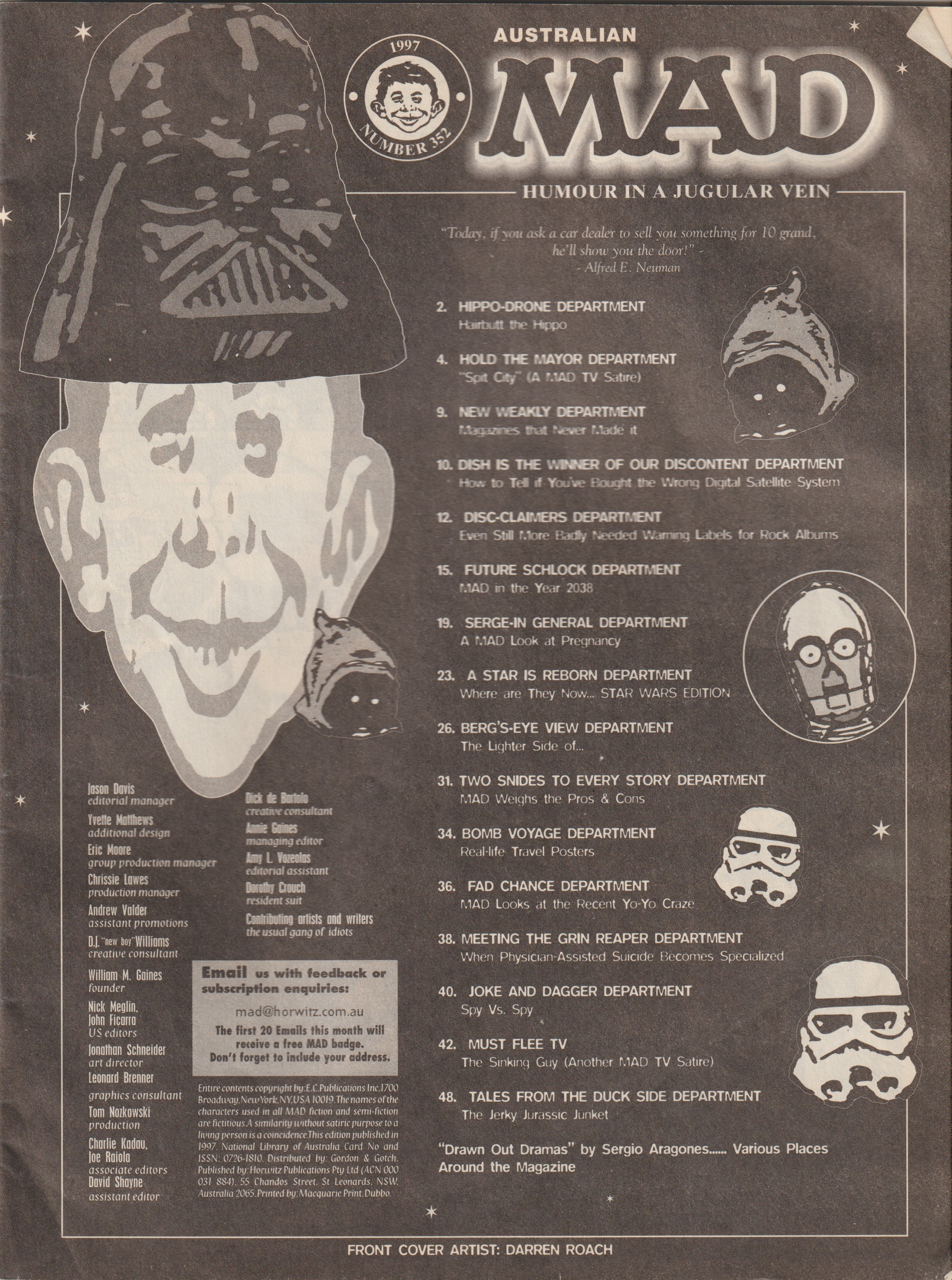 MAD Magazine #352 MAD Magazine (Australia) Updated: July 28th, 2021 Country: AustraliaCover: Inside we crush: The Star Wars TrilogySale price: AU$3.60Format: Magazine Editorial Editor: Dave WilliamsCover Artist: Darren Roach Additional Images